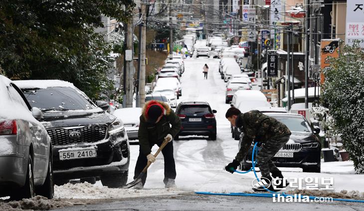 폭설이 내린 28일 오전 제주시 연동 골목길에 시민들이 나와 밤사이 쌓인 눈을 치우고 있다. 강희만기자