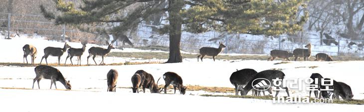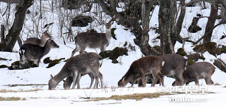 [한라일보] 지난 4일 제주시 용강동 제주마방목지에 흰점무늬가 선명한 꽃사슴 70여마리가 먹이를 찾는 모습이 포착됐다. 이 꽃사슴들은 유입종으로 농장에서 사육하던 꽃사슴들이 우리에서 탈출하거나 90년대에 의도적으로 방사한 이후 번식한 개체들로 보인다.