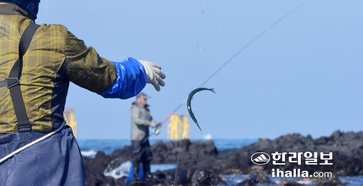 27일 제주시 애월읍 바닷가를 찾은 강태공들이 학꽁치를 낚고 있다. 이상국기자