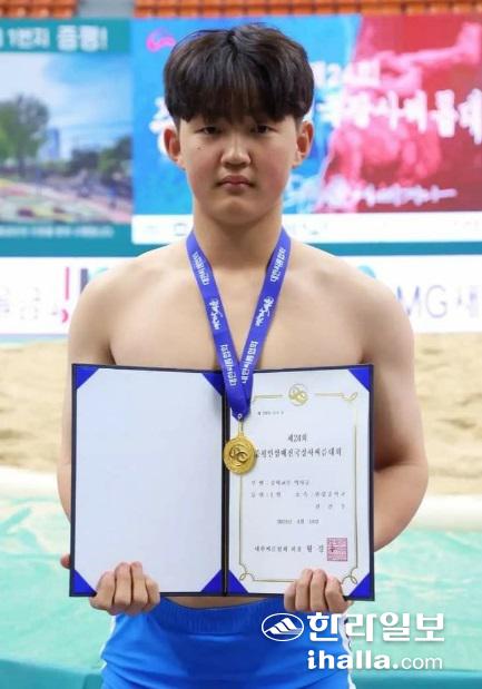 ![]() 제24회 증평인삼배 전국장사씨름대회에서 우승을 차지한 진건우. [한라일보] 진건우(한림중)가 제24회 증평인삼배 전국장사씨름대회에서 우승을 차지하며 2019년 김원빈 이후 4년 만에 전국 대회에서 장사가 탄생했다. 진건우는 지난 19일 충북 증평군 증평종합스포츠센터에서 열린 대회 남자중학부 역사급(-90㎏) 결승전에서 라현서(충남 태안중)에 2-1 역전승을 거두며 정상 등극에 성공했다. 진건우는 라현서와 결승전 첫 판에서 밧다리치기를 했으나 비디오 판독 결과 진건우의 무릎이 먼저 닿은 것으로 판명되며 0-1로 밀렸다. 하지만 두번 째 판에서 상대의 들배지기 공격을 되치기로 꺾었다. 최후의 승부인 세 번째 판에서 다시 상대가 들배지기를 시도했지만 진건우는 밧다리치기를 성공시키며 2-1 역전승을 장식했다. 진건우가 이번 대회에서 우승을 차지하며 2018년 홍지혁과 2019년 김원빈이 전국소년체육대회에서 2년 연속 정상에 오른 뒤 4년 만에 씨름 명문 한림중에 금메달을 안겼다. 진건우는 앞서 첫 경기에서 박주환(전북 금산중)을 들배지기로 제압하며 8강전에 진출했다. 8강전 상대는 장예준(증평중)이었다. 장예준 마저 밧다리치고 꺾으면서 준결승전에 올랐다. 준결승전에서 진건우는 전민기(울산 무룡중)를 맞아 밀어치기와 들배지기로 꺾으면서 2-0으로 승리했다. #한림중 진건우 #증평인삼배 전국장사씨름 #역사급 정상 등극 <저작권자 © 한라일보 (http://www.ihalla.com) 무단전재 및 수집·재배포 금지 > |