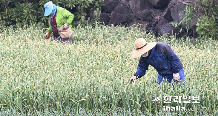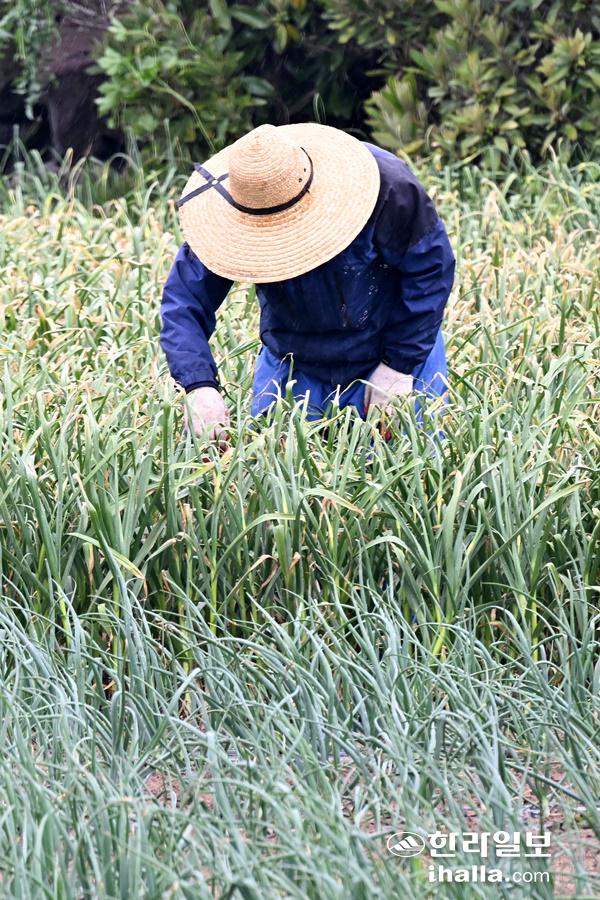 [한라일보] 24일 제주시 구좌읍 한 밭에서 농민이 잎마늘 손보기 작업을 하고 있다. 이상국기자