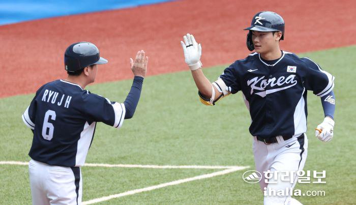 ![]() 6일 중국 저장성 항저우 인근 사오싱 야구·소프트볼 스포츠센터 제1구장에서 열린 2022 항저우 아시안게임 야구 슈퍼라운드 2차전 한국과 중국의 경기. 2회초 무사 1루 한국 김주원이 우월 투런 홈런을 치고 하이파이브를 하고 있다. 연합뉴스 한국 야구가 2022 항저우 아시안게임에서 금메달을 놓고 대만과 다시 격돌한다. 류중일 감독이 이끄는 한국 야구대표팀은 6일 중국 저장성 사오싱 야구·소프트볼 스포츠센터 1구장에서 열린 대회 슈퍼 라운드 2차전에서 김주원(NC 다이노스)과 강백호(kt wiz)의 대포 두 방 등 안타 16개를 터뜨려 중국을 8-1로 완파했다. 조별리그를 반영한 슈퍼 라운드 성적 2승 1패를 거둔 한국은 이날 오후 열리는 대만-일본전의 결과에 상관없이 2위로 결승에 진출했다. 이미 2승을 거둔 대만은 일본(2패)에 패하더라도 동률이면 승자승을 가장 먼저 따지는 대회 규정에 따라 우리나라를 꺾은 덕에 1위로 결승에 오른다. 지난 2일 조별리그에서 대만에 0-4로 완패한 우리나라는 대회 4회 연속 우승에 도전하는 최후의 일전에서 설욕할 기회를 잡았다. 한국과 대만의 금메달 결정전은 7일 오후 7시(한국시간) 같은 장소에서 열린다. 한국은 급성장한 중국을 상대로 경기 초반 점수를 뽑아내 경기를 유리하게 풀어갔다. 2회 선두 타자 강백호가 깨끗한 우전 안타로 출루하자 김주원이 오른쪽으로 한 차례 큼지막한 파울 홈런을 친 뒤 이번에는 중국 우완 선발 투수 왕웨이이의 복판에몰린 속구를 그대로 퍼 올려 우측 담을 넘어가는 선제 2점 아치를 그렸다. 조별리그 태국과의 경기에서 솔로 홈런을 날린 김주원의 이번 대회 두 번째 홈런이다. 김형준(NC)과 김혜성(키움 히어로즈)의 안타로 이어간 1사 1, 3루에서는 최지훈(SSG 랜더스)이 희생플라이를 날려 3-0으로 점수를 벌렸다. 3회에는 강백호가 투아웃 주자 없는 상황에서 중국 두 번째 투수인 좌완 왕샹의빠른 볼을 퍼 올려 대형 우월 솔로포를 터뜨렸다. 타격 부진으로 6번 타순으로 내려간 강백호는 첫 홈런과 멀티 히트(한 경기 안타 2개 이상)를 동시에 작성했다. 한국은 활발한 공격으로 4회에도 2점을 추가해 사실상 승패를 갈랐다. 김성윤(삼성 라이온즈), 최지훈의 안타로 엮은 1사 1, 2루에서 3번 타자 윤동희(롯데 자이언츠)가 중견수 앞에 떨어지는 2루타로 김성윤을 홈으로 보냈다. 이어진 1사 2, 3루에서 노시환(한화 이글스)이 6-0으로 달아나는 희생플라이를 쳤다. 승패 추가 한국 쪽으로 기운 8회에는 안타와 실책으로 잡은 2사 1, 2루에서 문보경(LG 트윈스)이 우익수 쪽 주자 일소 2루타로 쐐기를 박았다. 최지훈과 강백호가 각각 4타수 3안타를 날리고, 노시환과 김주원, 김성윤이 안타 2개씩 터뜨리는 등 한국은 선발 타자 전원 안타를 달성해 결승에서 기대감을 높였다. 홍콩을 상대로 한 조별리그 첫 경기에 이어 닷새 만에 등판한 한국 선발 투수 원태인(삼성)은 다양한 변화구로 중국 타선을 농락하며 안타 3개만 맞고 삼진 6개를곁들여 6이닝을 0점으로 막았다. 유일한 고교생 투수 장현석(8회·마산용마고)은 8회 세 번째 투수로 마운드에 올라 2사 1루에서 루윈에게 좌선상에 떨어지는 3루타를 맞고 실점했으나 대타 왕솨이를 삼진으로 돌려세우고 불을 껐다. #아시안게임 #류중일 #김주원 #한라일보 <저작권자 © 한라일보 (http://www.ihalla.com) 무단전재 및 수집·재배포 금지 > |