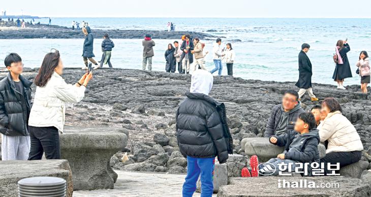 29일 제주시 협재해수욕장을 찾은 관광객들이 제주의 청정 겨울바다 정취를 즐기고 있다. 강희만기자