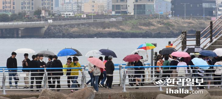 2일 제주시 이호테우해수욕장을 찾은 관광객들이 비날씨에 우산을 쓰고 경치를 구경하고 있다. 이상국기자
