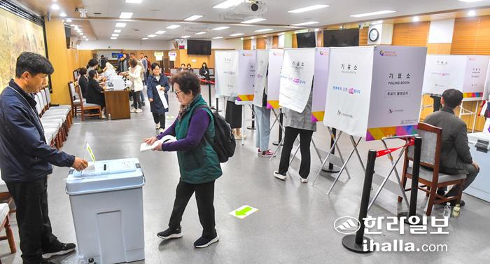 [한라일보] 제22대 국회의원 선거 사전투표일인 5일 오전 제주자치도의회 대회의실에서 마련된 제주시 연동 사전투표소에서 유권자들이 소중한 한표를 행사하고 있다. 이날 오전 11시 10분 기준 제주지역 사전 투표율 유권자 56만6611명 중 2만8496명이 참여해 5.03%를 보이고 있다.