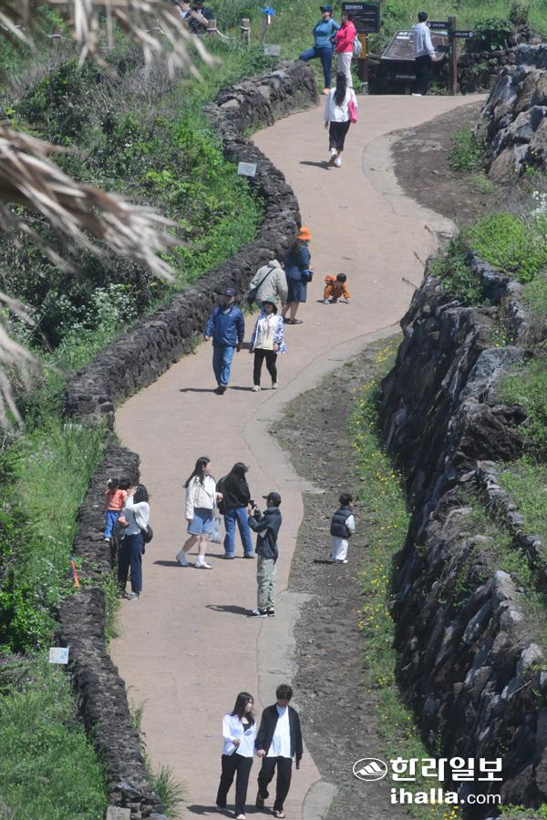 24일 제주시 함덕서우봉을 찾은 관광객들이 산책로를 걸으며 완연한 제주의 봄 정취를 만끽하고 있다. 이상국기자