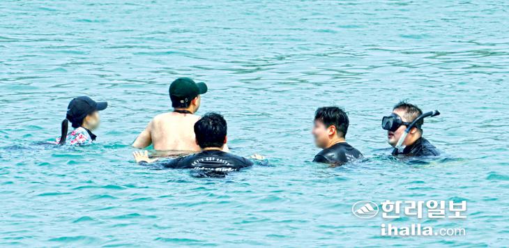 28일 제주시 한경면 판포리 포구를 찾은 관광객들이 조금은 이른 물놀이를 즐기고 있다. 강희만기자