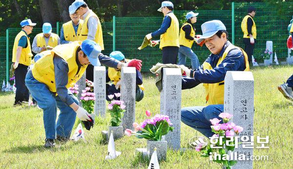 현충일을 이틀 앞둔 4일 국립제주호국원을 찾은 대한민국상이군경회 제주지부 회원들이 묘역 정비를 하고 있다. 이상국기자