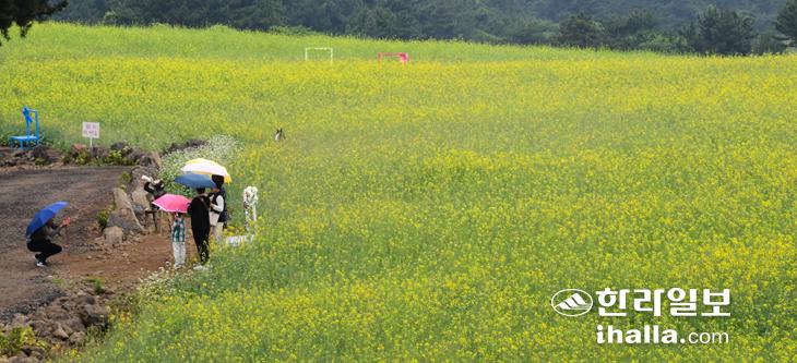 6일 제주시 오라동 한 유채밭이 노랗게 물들자 관광객들이 사진을 찍으며 제주 추억을 남기고 있다. 이상국기자