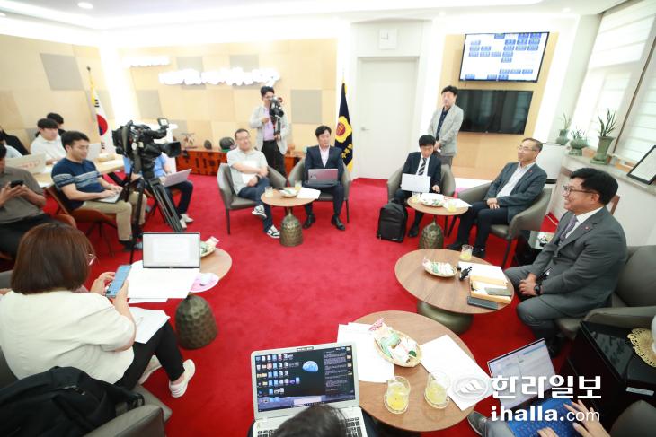 ![]() 김경학 제주도의회 의장이 18일 도의회 의장실에서 임기 종료를 앞두고 기자회견을 하고 있다. 사진=도의회 [한라일보] 제12대 제주특별자치도의회 전반기를 이끈 김경학 의장이 임기 2년간의 소회를 묻는 질문에 "가장 아쉬웠던 것은 민생 경제 회복"이라고 말했다. 앞으로의 정치 행보에 대해선 "(도의원 임기를 남겨둔) 지금 시점에선 구체적으로 언급하는 게 적절하지 않다"면서도 "정치적 공간이든 비정치적 공간이든, 그동안 받은 사랑을 도민사회에 돌려주기 위한 역할을 해 나가겠다"고 했다. 김경학 의장은 18일 도의회 의장실에서 열린 기자회견에서 이 같은 입장을 밝혔다. 이날 기자회견은 도의회 전반기 의장으로서 임기 종료를 앞두고 마련된 자리다. 제10대 도의원을 시작으로 12대까지 내리 3선에 당선된 김 의장은 2022년 7월 전반기 의장에 선출돼 오는 6월 30일 임기를 마치게 된다. 김 의장은 그동안의 성과에 대해 "의장으로 선출되며 다짐했던 게 45명 의원 모두가 주인공이 되는 의회를 만드는 것이었다"며 '관리형 의장', '조정형 의장'으로 의원들이 잠재력을 발휘하고 지혜와 역량을 모아나가는 데 역할을 했다고 강조했다. 그러면서 "견제와 감시라는 본연의 역할을 충실하며, 제주도와의 공동국비확보단 구성 등 협치를 통해 사상 최대의 국비 확보와 규제 개혁을 이뤄냈다"며 "활발한 조례 제개정과 현안 해결은 물론 소통창구도 확대했다"고 말했다. 김 의장은 "제주대병원에 행동발달증진센터가 문을 열고 제주대 특수교육과 설치도 조금씩 진전을 보이고 있다"면서 도민이 체감하는 실효성 있는 복지 정책도 성과로 꼽았다. ![]() 의장직을 내려놓은 뒤 의정 활동에 대해선 "의장으로 있을 때는 지역구 현안에 다소 소홀한 점이 있었다"면서 "평의원 신분으로 돌아가니 나머지 임기는 지역구 의원으로서 최선을 다하겠다"고 말했다. 앞으로의 정치 행보와 관련해 제주 행정체제 개편으로 시장 직선제가 도입될 경우 출마 의사를 묻는 질문에는 "지금 시점에서 구체적으로 얘기하는 것은 적절하지 않은 것 같다"면서도 "너무 큰 사랑을 받아 기대가 있으면 외면하기 쉽지 않다는 생각은 가지고 있다"며 가능성을 열어뒀다. ![]() ■기사제보 ▷카카오톡 : '한라일보' 또는 '한라일보 뉴스'를 검색해 채널 추가 ▷전화 : 064-750-2200 ▷문자 : 010-3337-2531 ▷이메일 : hl@ihalla.com ▶한라일보 다음채널 구독 바로가기 <저작권자 © 한라일보 (http://www.ihalla.com) 무단전재 및 수집·재배포 금지 > |
