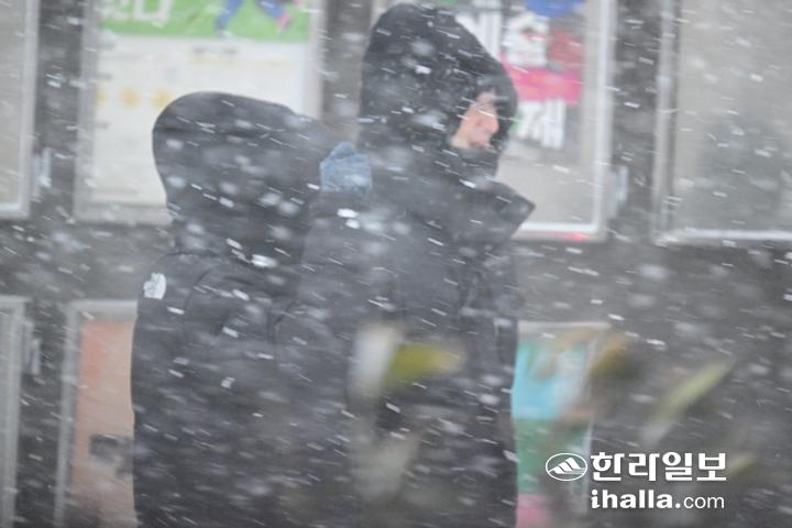 ![]() 눈 쌓인 제주국제공항. 한라일보DB [한라일보] 강추위가 찾아온 제주지방에 많은 눈이 내리면서 제주공항이 일시 폐쇄되는 등 제주섬이 일시 고립됐다. 8일 제주지방기상청에 따르면 제주지방은 찬 대륙고기압의 영향으로 서해상에서 만들어진 눈 구름대가 유입되며 이날 오후까지 많은 눈이 내릴 것으로 보인다. 제주산지에 대설경보, 나머지 지역에 대설주의보가 내려진 가운데 이날 오전 6시 기준 주요 지점의 24시간 최심신적설을 보면 한라산 삼각봉 19.2, 어리목 18.9, 사제비 18.9, 송당 9.9, 가시리 9.2, 한남 8.9, 와산 6.9, 산천단 6.5, 성산수산 8.3 ,성산 8.2, 표선 7.3, 제주남원 5.9, 제주 3.0㎝를 기록 중이다. 이로 인해 제주공항이 항공기 이동지역 제설작업을 위해 활주로 운영이 이날 오전까지 중지되면서 항공기 운항도 전면 중단되고 있다. 출·도착 40여편이 결항된 상황으로 관광객들의 큰 불편이 예상된다. 제주공항에는 급변풍(돌풍) 경보와 저시정 경보, 강풍경보 등이 내려졌다. ![]() 8일 제주공항에 많은 눈이 내리면서 제설작업으로 공항이 폐쇄되자 출발대합실이 크게 붐비고 있다. 강희만 기자 번영로, 평화로, 한창로, 남조로 등은 대형·소형 차량 모두 월동장구를 갖춰야 운행이 가능하고 제1산록도로, 제2산록도로, 첨단로, 애조로 등에서는 월동장구를 갖추지 않은 소형차량은 운행할 수 없다. 한라산 7개 탐방로는 모두 통제됐으며 제주 한라산 둘레길 등 산간 탐방로도 출입이 금지됐다. 해상에는 풍랑특보가 내려진 가운데 제주 기점 여객선은 추자, 완도, 목포, 진도 등 4척이 결항됐다. 제주기상청은 8일 밤까지 제주산지가 5~10㎝, 많은 곳은 15㎝ 이상, 중산간과 동부지역 3~8㎝, 동부를 제외한 해안지역에도 1~5㎝의 많은 눈이 추가로 쌓이겠다고 예보했다. 비가 내리는 지역에선 5~10㎜의 강수량이 예상된다. ![]() 대설특보가 내려진 8일 제주지방에 많은 눈이 내리고 있다. 산간지역에 대설경보, 해안지역에도 대설주의보가 발효중이다. 강희만기자 기온도 급격히 떨어지면서 9일 아침에는 영하권을 보이겠다. 8일 낮 최고기온은 2~5℃, 9일 아침 최저기온 -1~2℃가 되겠고 낮 최고기온이 8~12℃까지 오르면서 추위는 풀릴 전망이다. ■한라일보 기사제보 ▷카카오톡 : '한라일보' 또는 '한라일보 뉴스'를 검색해 채널 추가 ▷전화 : 064-750-2200 ▷문자 : 010-3337-2531 ▷이메일 : hl@ihalla.com ▶한라일보 유튜브 구독 바로가기 <저작권자 © 한라일보 (http://www.ihalla.com) 무단전재 및 수집·재배포 금지 > |