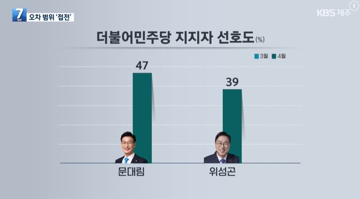 ![]() KBS제주 방송 화면 캡처. [한라일보] 6·3제주자치도지사 선거 더불어민주당 후보 경선 결선 투표를 앞두고 문대림 후보와 위성곤 후보가 접전을 벌이고 있다는 여론조사 결과가 나왔다. KBS 제주방송총국이 여론조사 전문 기관 한국리서치에 의뢰해 지난 13일부터 14일까지 이틀 동안 18세 이상 제주도민 1000명을 대상으로 실시한 여론조사에서 지지후보를 물은 결과 문대림 후보 40%, 위성곤 후보 36%로 문 후보와 위 후보가 오차범위 내 접전으로 나타났다. 이밖에 지지하는 사람이 없다는 응답과 모름·무응답은 22%이다. 민주당 경선 규정에 따라 문대림 후보에게 25% 감산을 적용하면, 문 후보는 30%, 페널티가 없는 위 후보는 36%로 여전히 오차범위 내 경합이다. 민주당 본경선 후 탈락한 오영훈 지사가 위성곤 후보를 공개 지지하면서 두 후보간의 지지도가 접전 양상으로 좁혀진 것으로 보여진다. 실제 경선에서 탈락한 오영훈 지사의 지지 표심이 어디로 이동했는지 물은 결과 1차 경선 이전 오영훈 지사를 지지했다고 답한 응답자 가운데, 45%는 위성곤 후보, 25%는 문대림 후보를 택한 것으로 조사됐다. ![]() KBS제주 방송화면 캡처. 정당 지지도는 더불어민주당 68%, 국민의힘 9%, 조국혁신당 2%, 개혁신당과 진보당 각 1%이다. 이번 여론조사는 휴대전화 안심번호 무작위 추출을 통한 전화 면접 조사 방식으로 진행됐고 표본오차는 95% 신뢰수준에 ±3.1%p, 응답률은 27.9%이다. 이밖에 자세한 사항은 중앙여론조사심의위원회 홈페이지를 참조하면 된다. 한편 민주당 제주지사 후보 경선 결선투표는 16일부터 18일까지 사흘간 도민선거인단과 권리당원을 대상으로 실시된다. 투표결과는 각각 50%씩 반영되며 문대림 후보에게는 탈당 이력에 따른 25% 감산 페널티가 적용된다. ■한라일보 기사제보 ▷카카오톡 : '한라일보' 또는 '한라일보 뉴스'를 검색해 채널 추가 ▷전화 : 064-750-2200 ▷문자 : 010-3337-2531 ▷이메일 : hl@ihalla.com ▶한라일보 유튜브 구독 바로가기 <저작권자 © 한라일보 (http://www.ihalla.com) 무단전재 및 수집·재배포 금지 > |