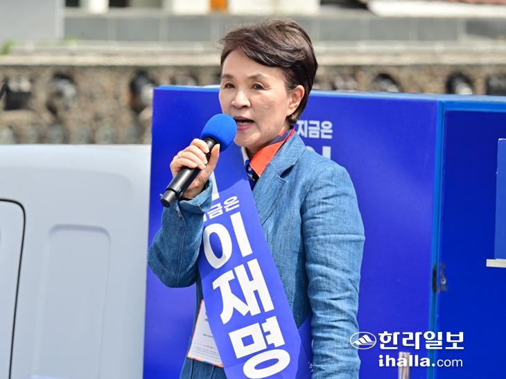 고향 찾은 강금실 더불어민주당 총괄선거대책위원장이 22일 제주시내 동문시장 앞 광장에서 이재명 후보 유세에 앞서 연설하고 있다. 강희만 기자