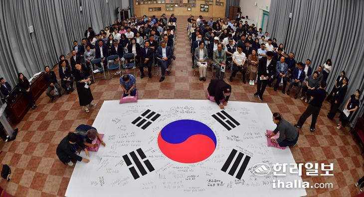 13일 제주시청 1별관 회의실에서 광복 80주년을 맞아 광복의 역사적 의미를 되새기고 태극기 달기 운동 참여를 확산시키기 위해 '시민 서명문 태극기 챌린지' 행사가 열리고 있다. 강희만기자