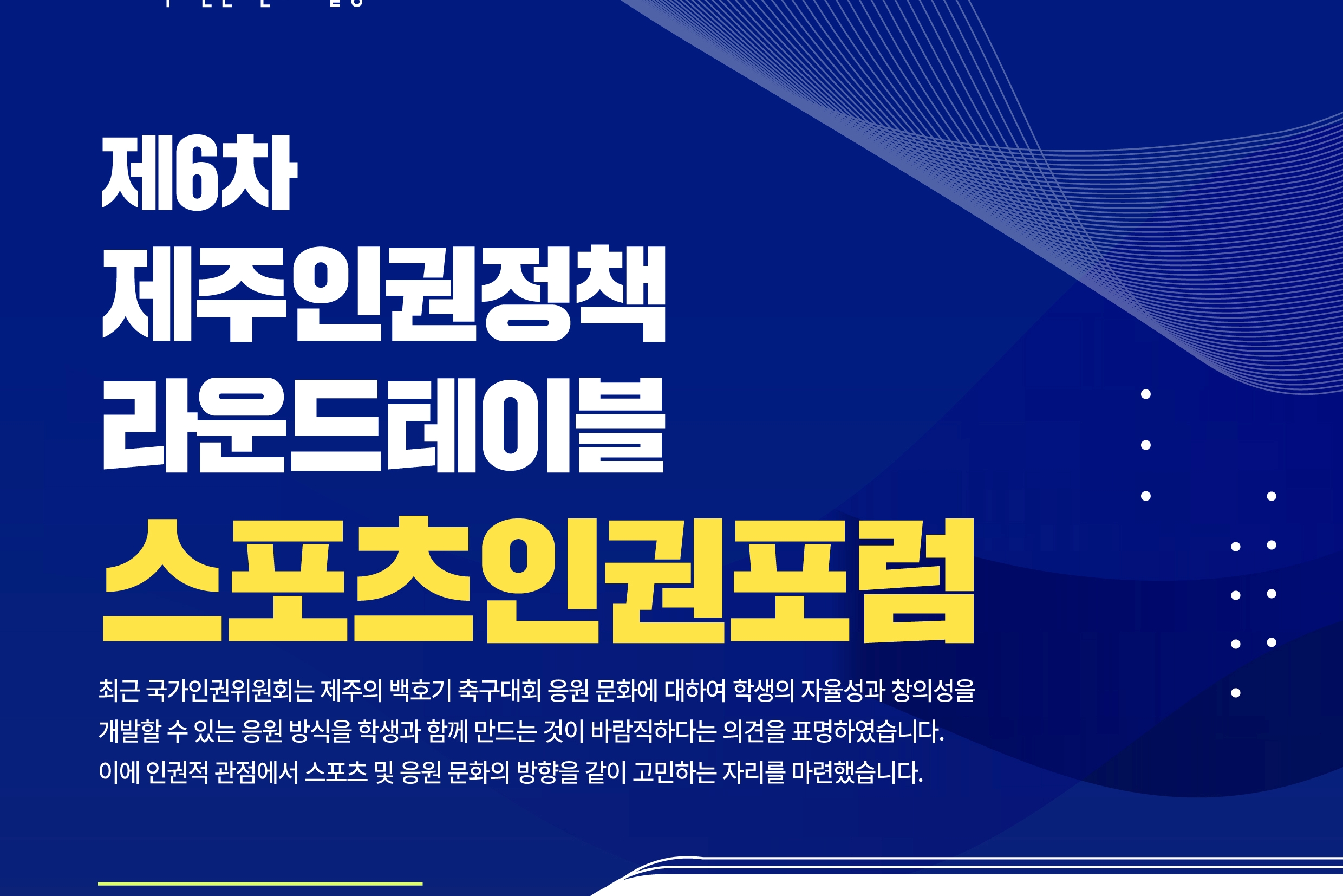 [한라일보] 국가인권위원회(이하 인권위) 제주출장소는 오는 29일 오후 3시 제주인권교육센터에서 ‘제6차 제주인권정책라운드테이블 스포츠인권포럼’을 개최한다고 24일 밝혔다. 주제는 ‘제주 백호기를 통해 본 스포츠 응…