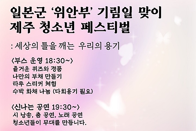 [한라일보] 광복 80주년인 올해 일본군 ‘위안부’ 피해자 기림의 날을 맞아 제주에서 기림행사가 열린다. 제주평화나비가 주관하고 제주 청소년 평화나비가 주최하는 ‘세상의 틀을 깨는 우리의 용기, 제주 청소년 페스티벌…
