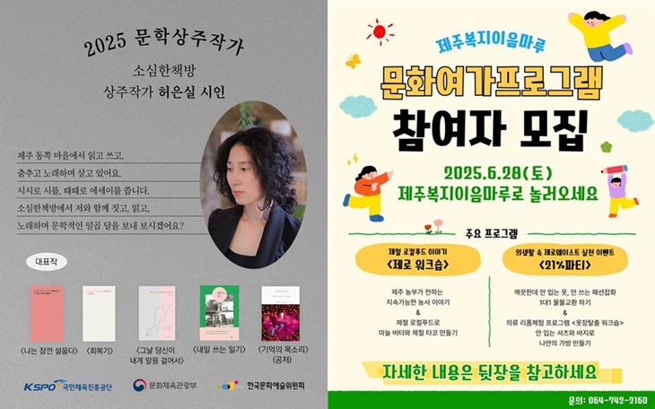 ㅣ소심한책방 문학상주작가 선정 제주시 구좌읍 종달리에 위치한 독립서점 소심한 책방이 한국문화예술위원회가 주관하는 2025년 문학상주작가 지원사업에 선정됐다. 이에따라 허은실 시인을 상주작가로 초청해 문학 창작 프…
