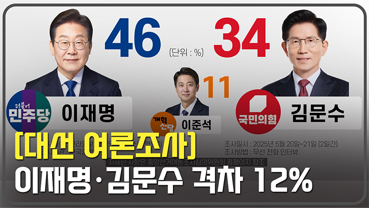 [영상] 대선후보 지지도 이재명·김문수 격차 12%··· 양자대결도 이재명 우세