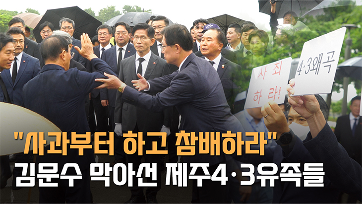 [영상] "사과부터 하고 참배하라"··· 김문수 막아선 제주4·3유족들