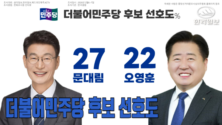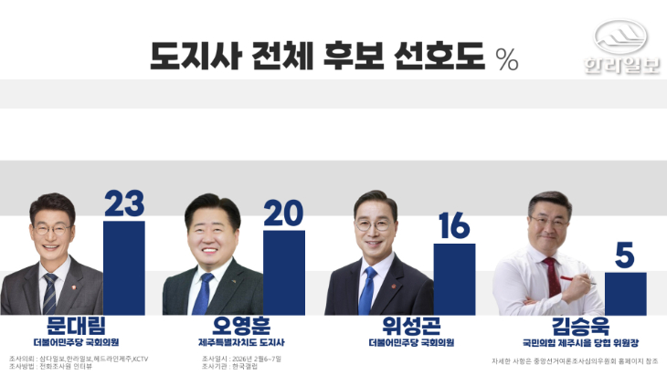 [한라일보] 제주도지사 후보 선호도 조사 결과, 더불어민주당 주자들의 강세 속에 치열한 선두 다툼이 벌어지고 있습니다. 전체 후보 선호도에서 문대림 더불어민주당 국회의원이 23퍼센트로 1위를 차지했고, 오영훈 제주도…