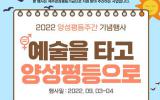 [한라일보] 성평등 문화 확산을 위한 다양한 행사가 곳곳에서 펼쳐진다. 'A.C.E. 예술제(Art&Culture&Equality)'에 이어 9월 첫 주 양성평등주간 기념행사가 예정돼 있다. 올해 양성평등주간 기념행사의 캐치프레이즈는 '예술을 타고 양…