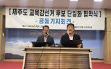 보수 성향 제주도교육감 예비후보들의 '단일화' 밑그림이 공개됐다. 고창근(71)·김광수(69) 제주도교육감 예비후보는 12일 제주도의회 도민카페에서 '교육감 선거 단일화 협약식'을 개최했다. 앞서 지난 5일 고 예비후보는 기자…