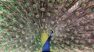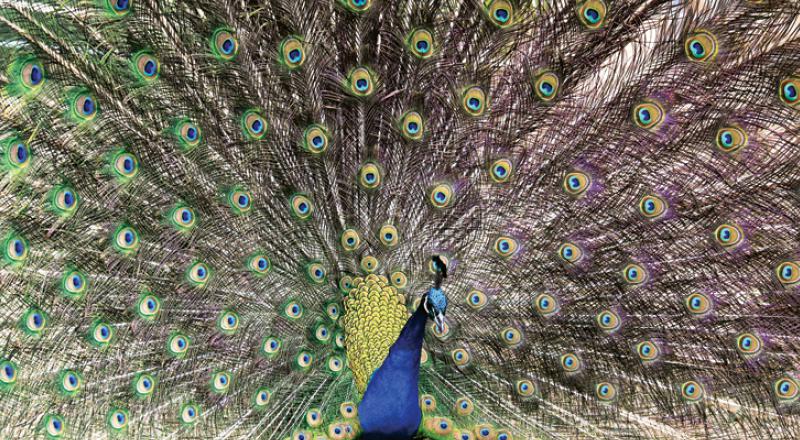 시선 사로잡는 공작새4일 제주시 한림읍 한림공원에서 수컷 공작새가 깃을 부채처럼 활짝 펼쳐 시선을 사로 잡고 있다. 강희만기자