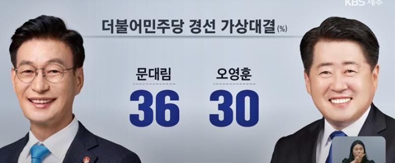 [한라일보] 더불어민주당 문대림 국회의원과 오영훈 제주지사가 오는 6월3일 제주특별자치도지사 선거 후보 선호도에서 접전을 벌이고 있다. 설 명절을 앞두고 제주지역 언론사 여론조사 중 가장 늦은 15일 발표된 KBS 제주방송총국 조사에서…