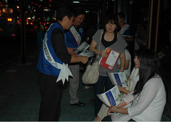 청소년들에게 학교폭력예방에 대한 전단지을 배포하고 있다.