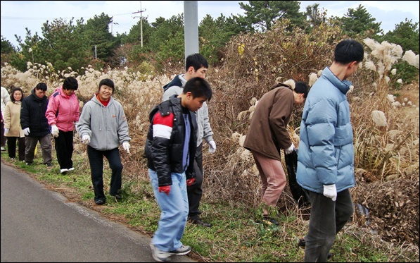 ◆ 추운 날씨에도 아랑곳 하지 않고 주변 쓰레기 줍기에 나선 원생들<사진=최찬규 시민기자>