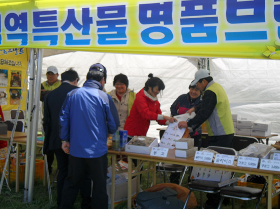 성산읍 공무원들의 김재윤 국회의원에게 성산읍 솔레오 및 지역 특산물을 판매하고 있다.