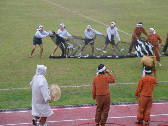 비오는 날씨에 선수단 및 지역주민들을 위해 무료차와 떡을 제공하고 있다.