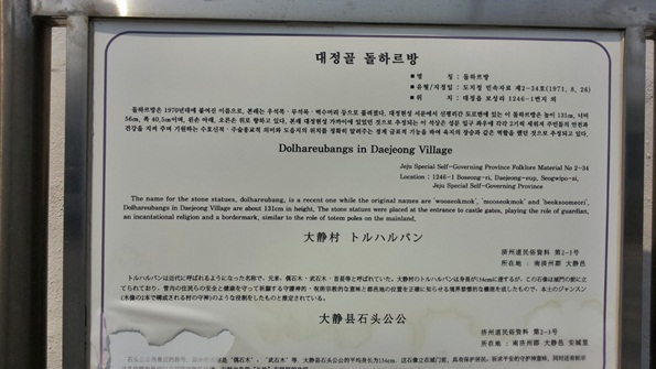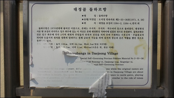 대정읍 보성리 1584-2번지 앞 제주특별자치도 민속문화재 제2-35호, 36호인 대정읍 돌하르방을 설명하는 안내판이 너덜너덜 바람에 나풀거리고 있다.