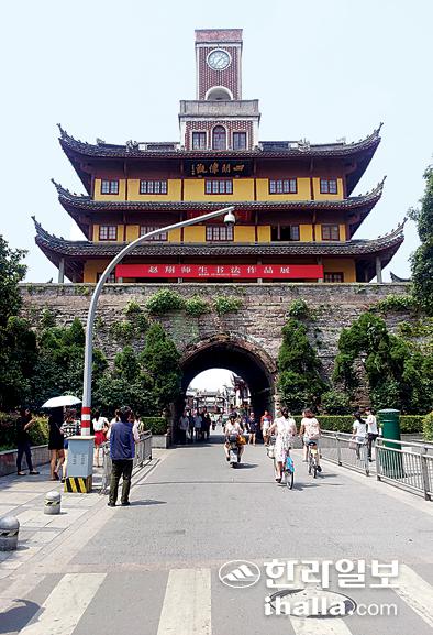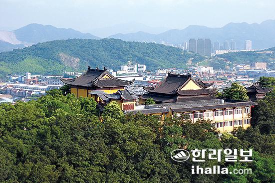 중국 절강성 영파시 오주탑에서 바라본 초보산 위원성 성곽 건물과 영파시 전경. 사진=이윤형기자