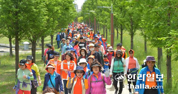 지난 5월 제주시민복지타운 광장에서 '동행 치매를 넘어'를 주제로 한 ‘2017 치매극복 전국걷기대회’가 열려 참가자들이 오라올레길을 걷고 있다. 강경민기자