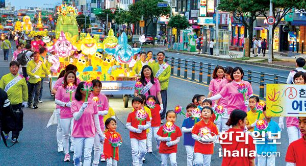 지난 12일 열린 부처님 오신날 연등행렬(아래). 강희만기자