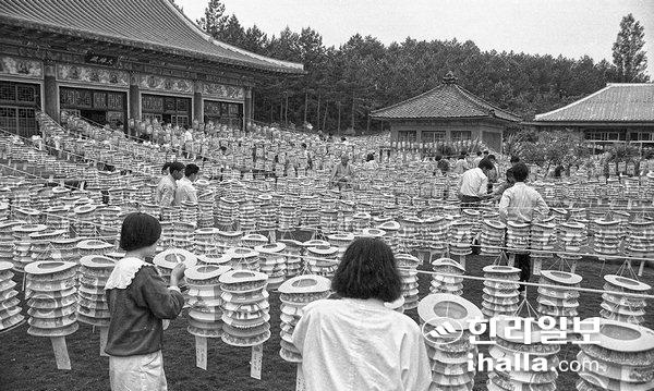 1989년도 부처님 오신날을 맞아 신자들이 연등을 달고 있는 모습. 한라일보DB