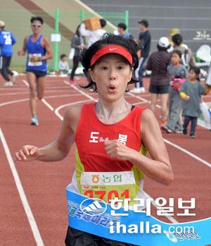 11일 제주시 조천운동장에서 열린 2018 제주감귤국제마라톤대회에서 하프코스 여성 1위 노성숙씨가 결승선을 통과하고 있다. 강희만기자