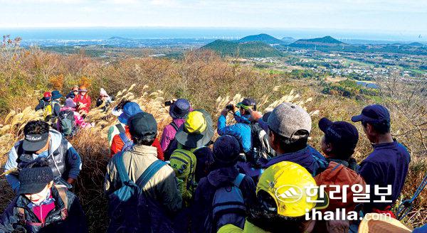 에코투어 참가자들이 제주시 조천읍 선흘리 소재 민오름 정상에 올라 제주 가을의 끝자락을 만끽하고 있다. 강희만기자