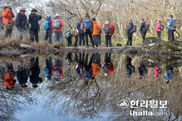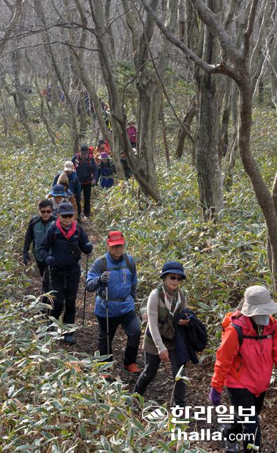 한라산 둘레길을 걷고 있는 에코투어 참가자들.