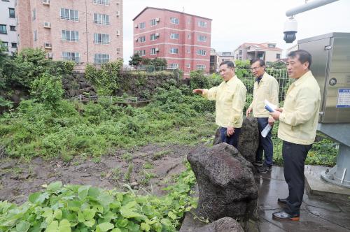 제주시(부시장 이영진)은29 날 집중호우에 따른 재해예방 사업장,건설공사장,저류지 등 재해취약지 현장 방문하여 시설물 사전점검을 실시하고 공사 관계자들을 격려 하였다. 이번 안전점검은 저류지 및 재해예방사업장은 물론 저지대 침수 취약지에 대한 안전관리 실태 등 사전 점검을 통해 현장에서 애로사항을 청취하고 집중호우로 인한 안전사고 예방과 피해를 최소화하기 위함이다.