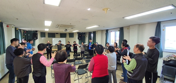 동화구연봉사단과 장애인들이 함께 율동과 기차놀이를 하면서 즐거워하는 모습