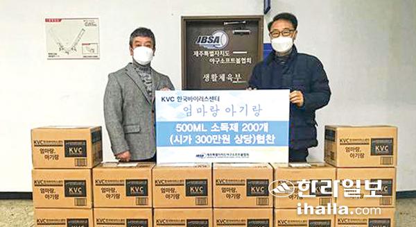 한국바이러스센터(제주지사장 김문철)는 최근 살균소독제 '엄마랑 아기랑' 200개(300만원 상당)를 제주특별자치도야구소프트볼협회(회장 박창선)에 협찬했다고 전했다.