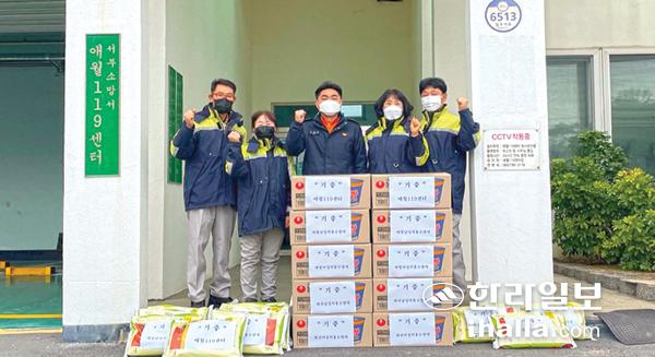 서부소방서 애월119센터(센터장 강경훈)와 애월남·여의용소방대(대장 윤이하, 김명숙), 하귀남·여의용소방대(대장 양지수, 윤명춘)와 함께 지난 5일 관내 홀로사는 노인 등 어려운 이웃 10가구를 방문해 50만원 상당의 생필품을 전달했다.