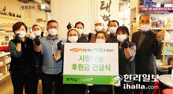 제주시 이호동 소재 태백산 제주본점(대표 이승재, 이전희)은 지난 5일 초록우산 어린이재단 제주지역본부(본부장 김희석)에 사랑나눔 후원금 107만2000원을 전달했다.