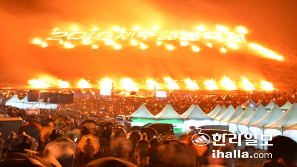 ▶들불축제 기원=1990년대 제주의 대표적인 관광자원은 '자연'이었다. 이에 겨울철은 제주관광의 비수기였다. 때문에 제주지역 경제 활성화를 위한 관광 비수기 대응 방안이 필요했다. 이에 대한 해결책으로 새 풀이 돋아나기 전 마을 공동목장에 동네 사람들끼리 모여 방애를 놓던 풍습과 정월 대보름날 무사 안녕을 기원하며 달집을 태웠던 행사를 합쳐 지난 1997년 정월 대보름날인 2월 22일 제주시 애월읍 어음리 평화로변 야초지에서 정월 대보름 들불 축제가 처음으로 시작됐다.