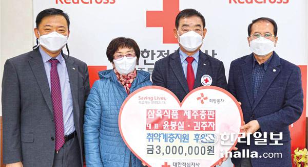 삼육식품제주총판(대표 윤봉실·김추자)은 지난 12일 제주적십자사 회장실에서 대한적십자사제주특별자치도지사(회장 오홍식)에 취약계층 지원을 위한 후원금 300만원을 전달했다.