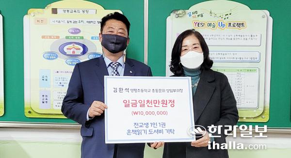 영평초등학교총동문회 김완석 상임부회장은 지난 12일 영평초등학교(교장 양정숙)에 학교발전기금 1000만 원을 전달했다. 김완석 상임부회장은 학교발전기금이 전교생 1인 1권 온책읽기에 사용되길 희망했고, 이에 학교는 전교생에게 1인 1권을 선물할 예정이다.