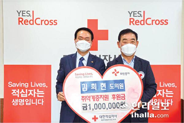 김희현 제주특별자치도의회 의원은 지난 15일 제주적십자사 회장실에서 대한적십자사제주특별자치도지사(회장 오홍식)에 취약계층 지원을 위한 후원금 100만원을 기탁했다.