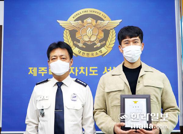 강남영(25·오른쪽)씨가 제주 서부소방서로부터 소방활동 유공 민간인 표창을 받았다.